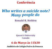 O Departamento de Psicologia e o CIEP-UE organizam no dia 6 de março a conferência «Who writes a suicide note? Many people do». A entrada é livre mediante inscrição prévia no secretariado do Departamento de Psicologia.